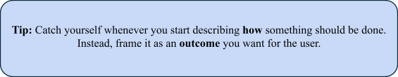 It’s easy to accidentally slip from problem definition to solution design. For instance, you might go from stating, “The credit card customer doesn’t know if her payment went through” to prescribing, “We need a text message confirmation and a take it to the future transaction view as soon as the user schedules the payment”. Suddenly, you’ve tied the team’s hands, and you might lose out on creative, possibly simpler or more robust alternatives.