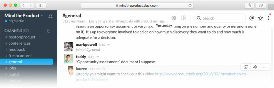 Sometimes you just need to ask a question or debate a solution. Sometimes you want a second opinion on something you’re building. Sometimes you just want to vent and get commiserations from fellow product managers. The Mind the Product Slack channel is an amazing tool for all of this and more – and we have 60,000+ product managers actively engaged every day. Join us!
